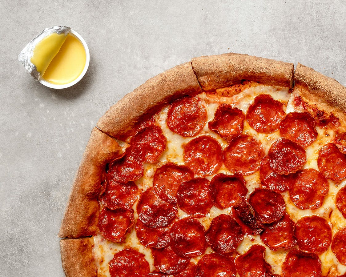 بيتزا أفضل تبدأ بالعجين. هذا هو السبب في أن جينتنا الأصلية المقشورة باليد يتم تحضيرها من أجود المكونات بما في ذلك الدقيق عالي البروتين والماء النقي. يتم توصيلها إلى مطاعمنا طازجًا ولا يتم تجميدها أبدًا ، وتظل طازجة حتى يتم خبزها بشكل مثالي من أجلك. ويتم تدقيقها ببطء وبشكل طبيعي وفي ذلك الوقت مما يزيد من نكهة العجين. والنتيجة هي عجينة خفيفة ورقيقة ولذيذة ، ومثالية للتغميس في صلصة الثوم اللذيذة